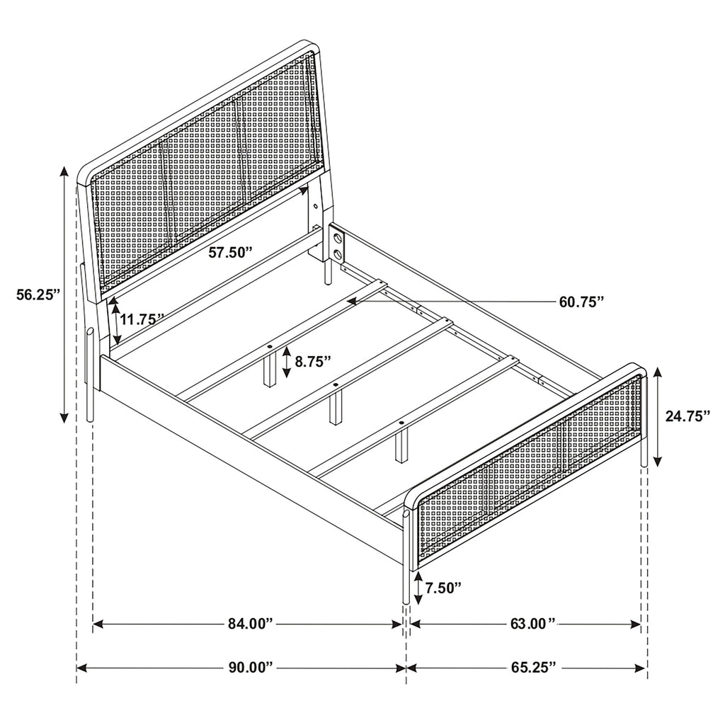 Bring a touch of natural elegance to your bedroom with this mid-century modern inspired panel bed. A refined sand wash finish highlights the warm tones of woven rattan cane panels, creating texture and depth across the headboard and footboard. Sleek aged brass metal legs lend subtle glamour and stability, balancing organic style with modern appeal. Built from a blend of rubberwood, engineered wood, and metal, this bed combines durability with a fresh fashion trend, transforming any bedroom into a relaxing retreat._x000D_ Key Features: • Queen bed crafted with woven natural cane panels for organic mid-century appeal • Eleven-step wire brushed sand wash finish highlights rich natural wood tones • Headboard and footboard framed in rubberwood for strength and durability • Aged brass finished tubular metal legs add a refined modern glam contrast • Constructed with solid wood, engineered wood, veneer, cane, and metal details • Foundation required for proper mattress support and long-lasting performance