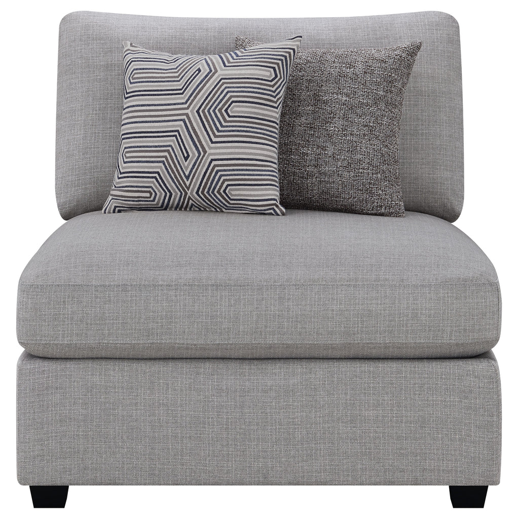 This armless chair offers versatility and modern appeal for today’s living spaces. Upholstered in soft grey fabric, its clean lines and plush cushions provide both comfort and style. Designed with a modular structure, it easily connects with matching components to form a sectional or stands alone as an accent seat. Crafted with solid wood legs, a sturdy frame, and reversible cushions wrapped in feather down, this upholstered chair delivers lasting durability and inviting comfort for any contemporary home. Key Features: • Armless chair features a modern silhouette in soft grey fabric for versatile styling • Modular design allows combination with matching components for custom layouts • Reversible seat and back cushions offer extended use and easy maintenance • Feather-down wrapping enhances plush comfort and luxurious seating feel • Crafted with solid wood legs and sturdy frame for lasting structural integrity • Ideal as a standalone accent seat or sectional component in modern living rooms