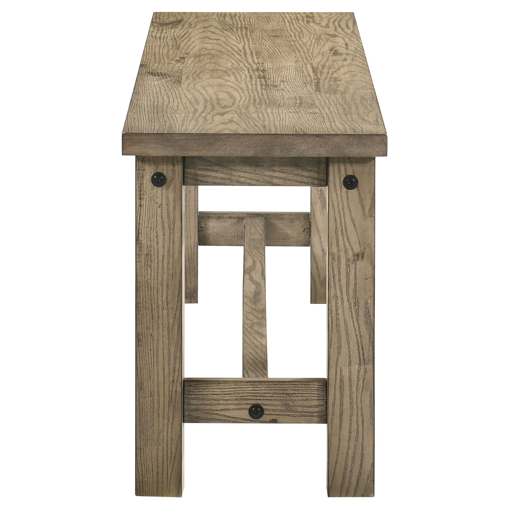 Crafted to welcome connection, this dining set invites you to gather, linger, and share life around the table. The rich vineyard oak finish enhances every grain with warmth, while the solid rubberwood frames offer grounded durability. With its sturdy draw leaf extension table and matching ladder-back seating, each piece balances rustic simplicity with timeless design. Whether it's everyday meals or festive moments, this set holds space for them all. Key Features: • Five-piece dining set includes extension table and four matching side chairs • Table extends from 62.75 to 86.5 inches with two 12-inch draw leaf extensions • Vineyard oak finish enhances rustic grain and natural wood character • Chairs feature tall ladder backs and sturdy stretchers for lasting support • Crafted from solid rubberwood for strength, weight, and enduring quality • Perfect for everyday meals or gatherings in farmhouse and transitional spaces
