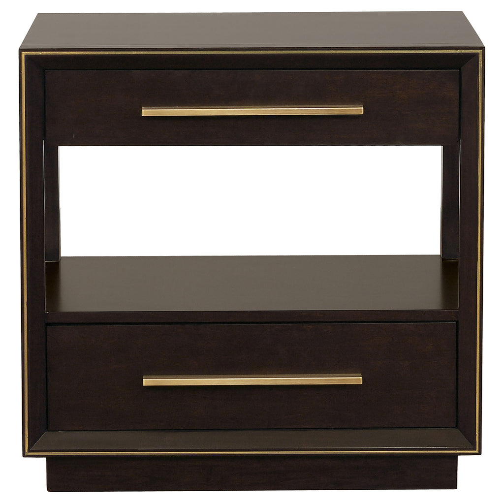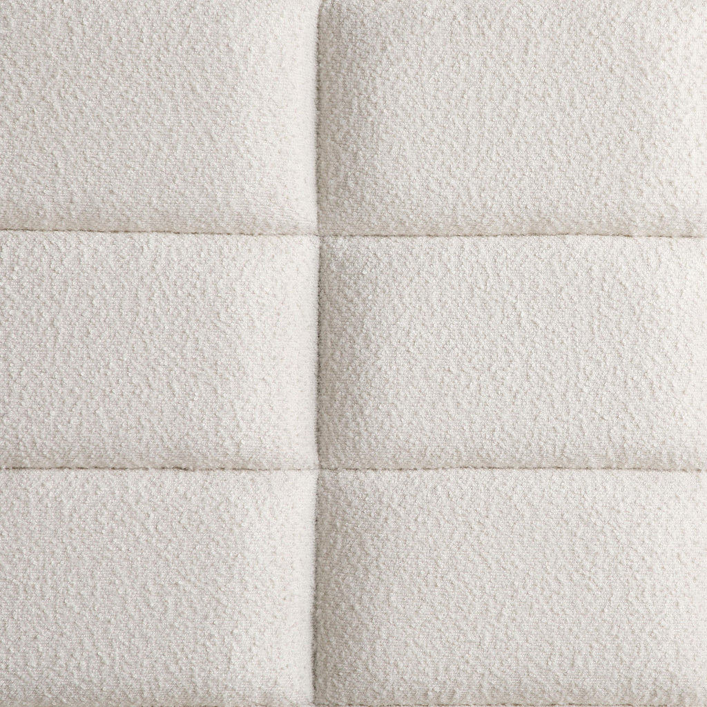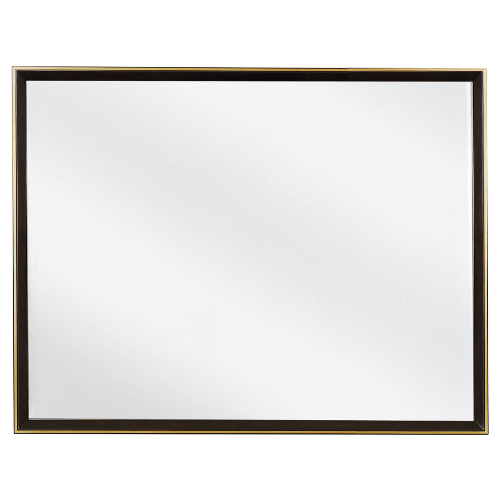 Geometric details from this queen four-piece bedroom set provide an interesting visual. Full of depth and warmth, the high upholstered headboard features a smoked peppercorn finish. This set is complete with a nine-drawer dresser and two-dresser nightstand and included shelf. Retro inspired details welcome structure and personality to any motif. Perfect above the dresser, the included mirror is clean and elongated. Key Features: • Bedroom set with panel bed, coordinated storage, and upholstered details • Smoked peppercorn wood finish delivers rich, modern tone • Bed features velvet-upholstered panels with grid tufting • Streamlined design blends modern styling with tailored accents • Crafted from poplar, birch veneer, engineered wood, and plywood • Gold-finish hardware adds contrast to dark wood and fabric surfaces