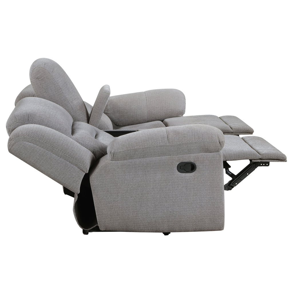 Designed for everyday comfort, this manual reclining sofa set brings plush relaxation to your living space. Upholstered in soft grey chenille, each piece features generously padded backs, pillow top arms, and smooth reclining mechanisms for personalized comfort. The loveseat’s console includes stainless steel cup holders and a soft-close compartment, while all pieces feature durable metal and plywood construction. This inviting set offers lasting comfort and timeless transitional style._x005F_x000D_ Key Features: • Manual reclining sofa set crafted for superior everyday comfort • Soft grey chenille upholstery creates a cozy, tactile texture • Dual reclining seats offer smooth, easy position adjustment • Pillow top arms and supportive backs enhance relaxation • Loveseat includes stainless cup holders and storage console • Durable metal and plywood framing ensures long-lasting use