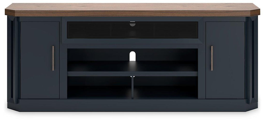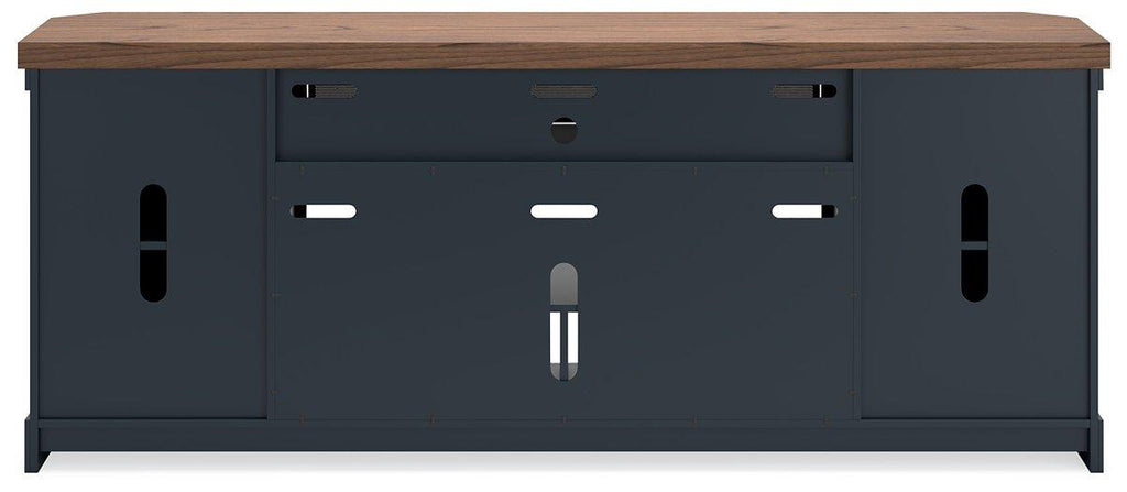 This TV stand combines casual contemporary design with modern appeal. Its combination of a thick-bodied wood-tone top with a slate blue cabinet is a smart choice on so many levels. Stow away electronics in the roomy cabinets, and use the upper shelf to conceal a soundbar speaker for a clean, integrated look. Adding a touch of romance to the scene, the fireplace insert brings warmth and beautiful ambiance to your living room. With the touch of a button, adjust the temperature and the flame brightness, and connect your device to the built-in wireless speakers. The flame effect includes a realistic-looking log set with glowing embers, along with an ambient down light.