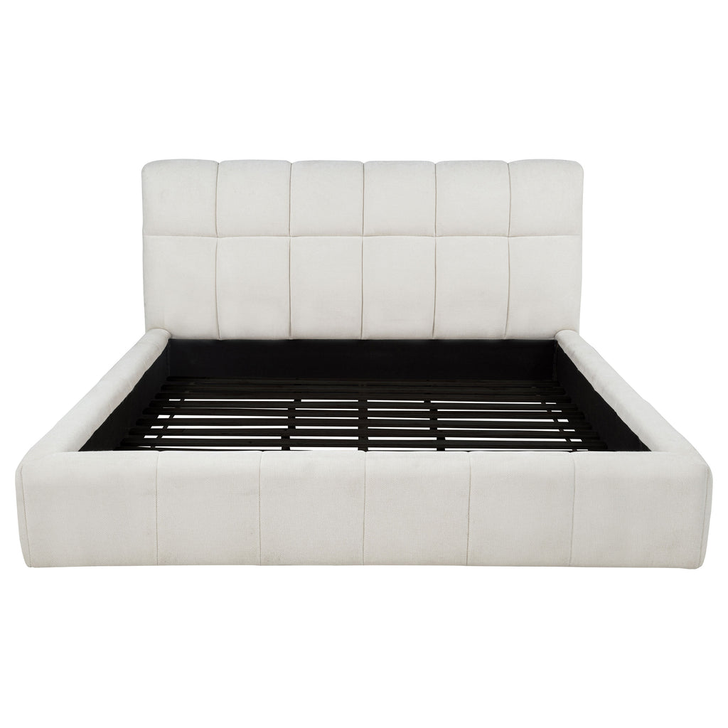 Tailored with bold lines and soft texture, this upholstered platform bed blends comfort with quiet strength. Vertical channel tufting runs along the headboard and foot rails, adding dimension and rhythm to the silhouette. Wrapped in plush fabric and fully slatted for support, it eliminates the need for a foundation. Crafted from solid and engineered wood, this bed invites modern serenity into any bedroom retreat. Key Features: • Queen platform bed with vertical tufting for subtle texture and visual rhythm • Cream fabric upholstery adds soft elegance with a light, airy modern palette • Slatted platform design supports mattress without needing a foundation • High headboard offers sculptural depth and a softly framed silhouette • Crafted from solid pine, engineered wood, and foam for strength and support • Perfect for minimalist or contemporary rooms with light, calming tones