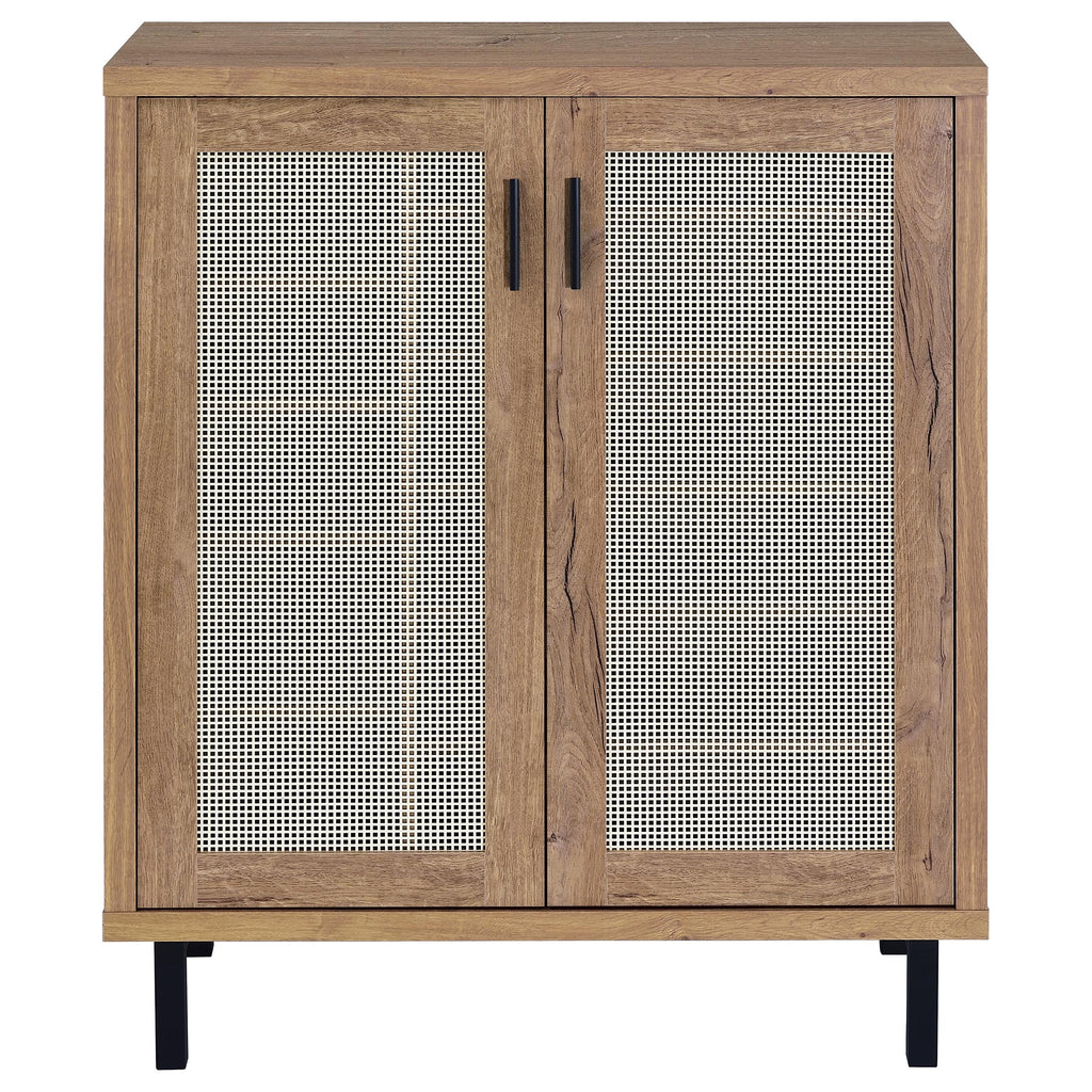 Enhance your entryway with this stylish shoe cabinet, pairing natural oak hues with modern, functional details. Crafted from engineered wood and laminate veneer, it features double doors framed by airy metal cane-style panels. Inside, an off-centered division and multiple adjustable shelves accommodate various shoe sizes, ensuring a personalized storage solution. Sturdy black metal legs anchor the piece, delivering a contemporary look that effortlessly streamlines your footwear collection. Key Features: • A chic shoe cabinet dressed in a natural oak finish • Airy metal cane-style door panels for ventilation and visual interest • Off-centered interior division and adjustable shelves for flexible storage • Engineered wood and laminate veneer construction ensures lasting quality • Supported by sturdy black metal legs for modern appeal • Perfect for organizing footwear in entryways, hallways, or closets