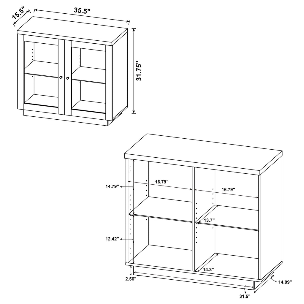 Refined symmetry meets purposeful display in this light oak accent cabinet. Framed glass doors open to reveal twin compartments divided by a central panel, each fitted with an adjustable tempered glass shelf. The soft grain of wood flows along clean lines, while black hardware adds grounding contrast. Designed to elevate living areas, dining rooms, or entryways, this cabinet blends function and harmony through thoughtfully balanced storage. Key Features: • Accent cabinet with framed glass doors and a center divider for dual storage zones • Light oak finish reveals wood-like texture for warmth and natural visual dimension • Two adjustable tempered glass shelves offer flexible organization and display • Black-finished hardware provides crisp contrast against light grain surfaces • Crafted from engineered wood, honeycomb board, and laminate veneer • Designed with tip-over restraint and concealed legs for added safety and support