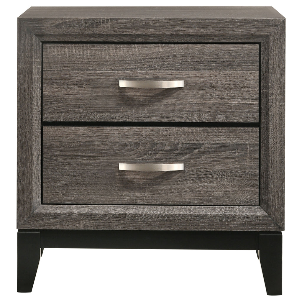 Modern design meets weathered appeal in this four-piece bedroom collection for a master or second bedroom. Each piece of the set has a gray oak finish with contrasting black accents and frames for a look that's understated yet bold. The queen bed has an impressive headboard and low footboard with black rectangular paneled accents. The elegant nightstand and dresser have deep drawers with lustrous silvery accented handles. The matching mirror has straight lines and is a perfect fit for the gorgeous dresser. Key Features: • Transitional style bedroom at a great value • Nickel finished hardware highlights two-tone grey oak finish • Black grooves create a dimensional look • Three-dimensional engineered foil paper laminate in grey oak and black • English dovetail drawer construction • Black finished legs are crafted of solid hardwood